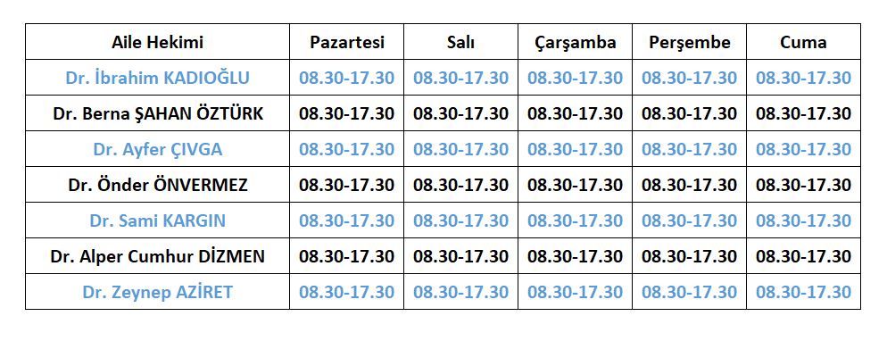 AİLE HEKİMLERİ ÇALIŞMA SAATLERİ