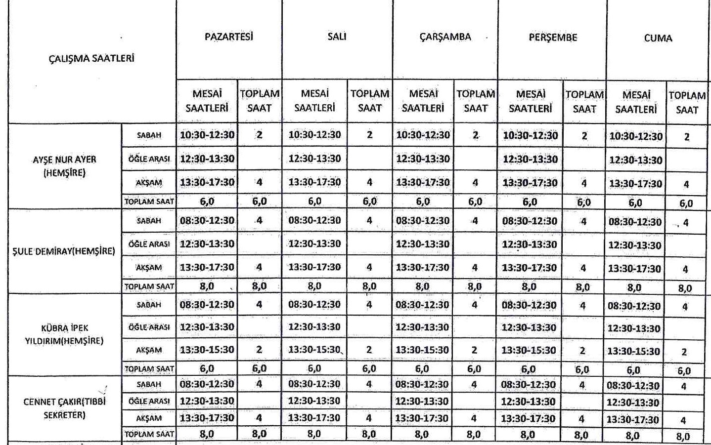 YARDIMCI SAĞLIK PERSONELİ ÇALIŞMA SAATLERİ